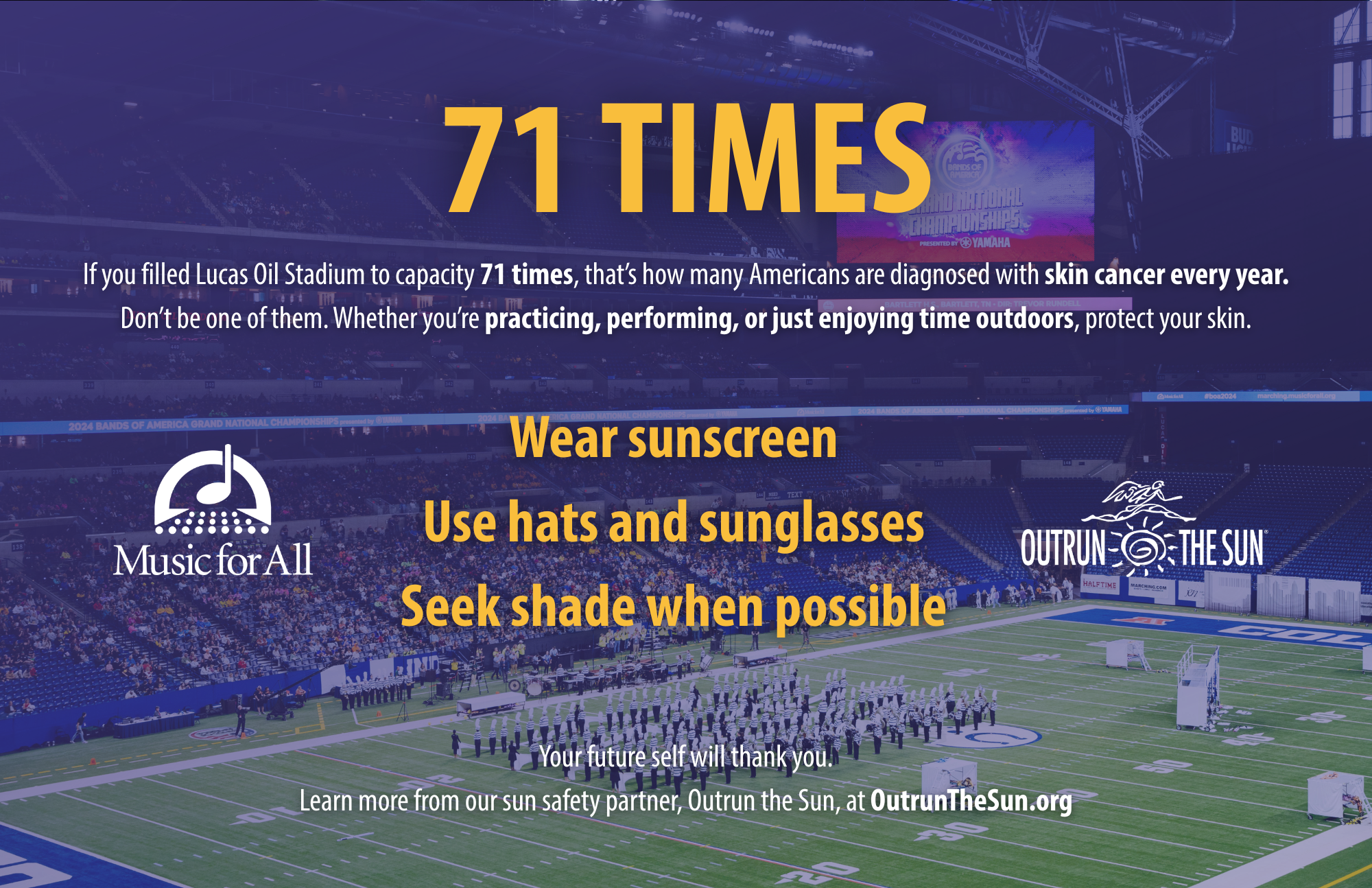 Together, Music for All, Bands of America, and Outrun the Sun are working to educate band students, their parents, and band directors about the importance of sun safety and skin cancer prevention. Messages are shared through podcast interviews, print and broadcast public service announcements, and more.